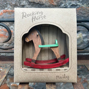 This timeless Rocking Horse is a wonderful addition to the mouse collection of accessories. Perfectly sized for Little Brother/Sister and Big Brother/Sister Maileg mice, this wooden rocking horse features a metal rod in the handles, ensuring mice with magnetic hands stay securely seated during their ride. Inspiring hours of imaginative play.