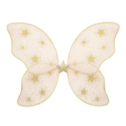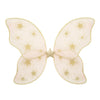 Enchanting starry night wings in soft pink. Ideal for dress-up, celebrations, or as a gift. Crafted from soft pink netting adorned with shimmering gold glitter stars, featuring a padded central gold star and matching glitter trim. Wings measure approximately H40cm x W50cm, with elasticated straps for easy wear. Wipe clean only. Safety tested. Not suitable for children under 36 months.